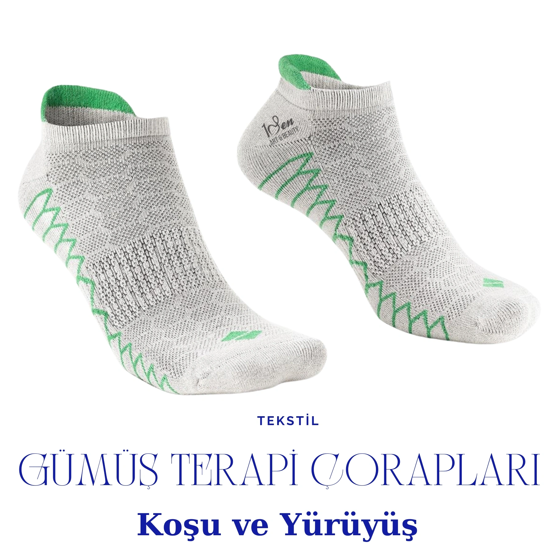 Gümüş Terapi Koşu & Yürüyüş Çorabı (Yeşil) Nefes alan yapısı, dikişsiz burun tasarımı ve gümüş iplik teknolojisi ile gün boyu konfor sağlar. Terlemeyi azaltmaya yardımcı olur, kötü kokuyu önler ve hareket sırasında ayaklarınıza hafiflik hissi verir. Koşu, yürüyüş ve günlük kullanım için idealdir.