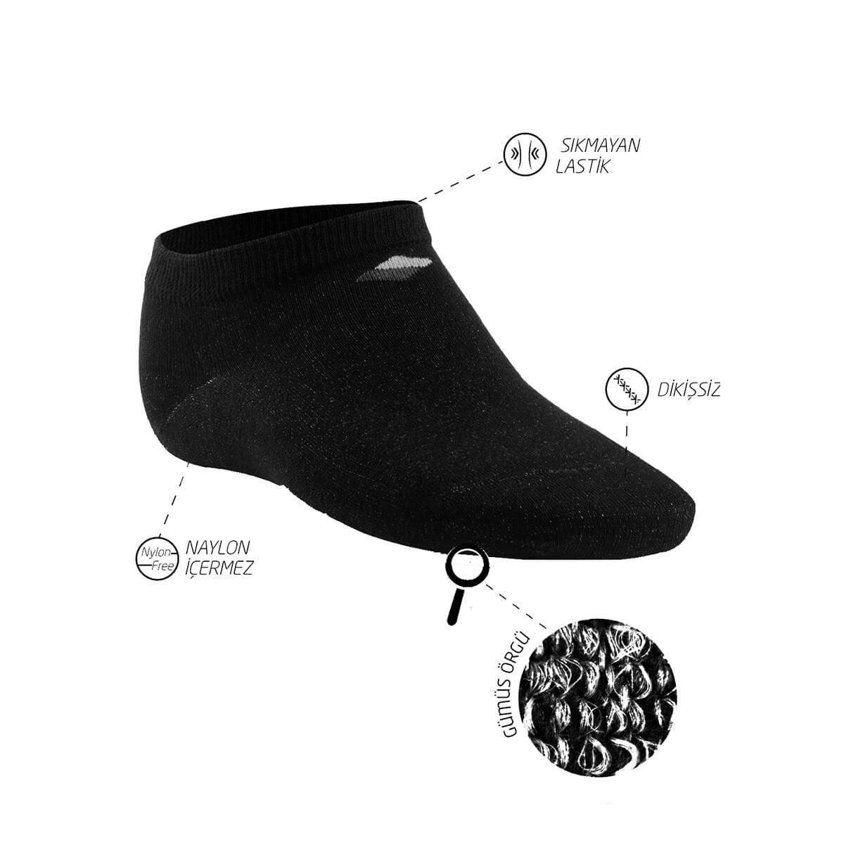 Ayakla temas eden saf gümüş iplik içeren özel örgü yüzeyi, koku oluşumunu azaltmaya yardımcı olur. Modal ağırlıklı doğal lif yapısı, nefes alabilirliği destekleyerek terleme kaynaklı rahatsızlık hissini azaltmaya katkı sağlar. Hafif ve esnek dokusu ayağı nazikçe sarar, uzun süreli kullanımlarda dahi baskı hissi oluşturmaz.