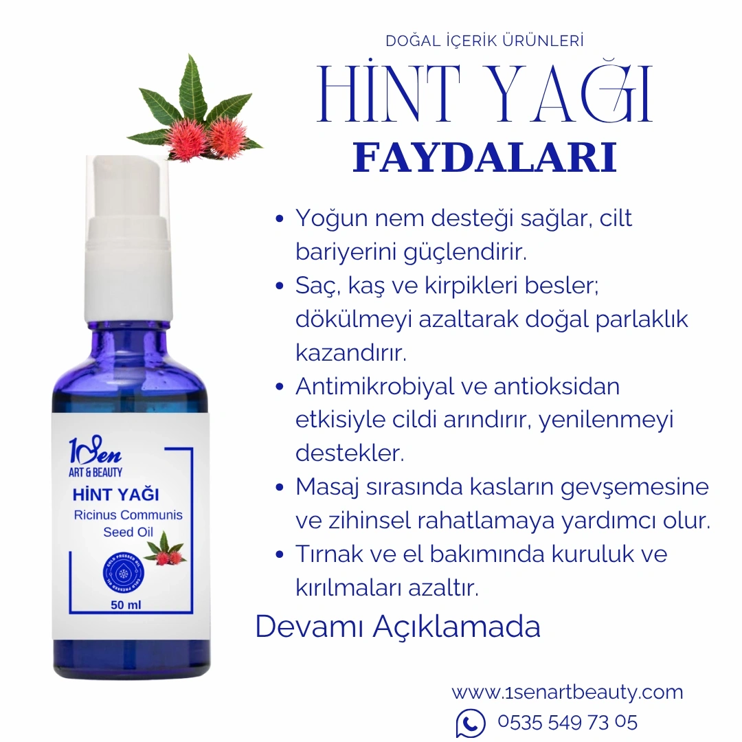 Hint yağının içeriğindeki risinoleik asit, ciltte su kaybını önleyerek uzun süreli nem sağlar.