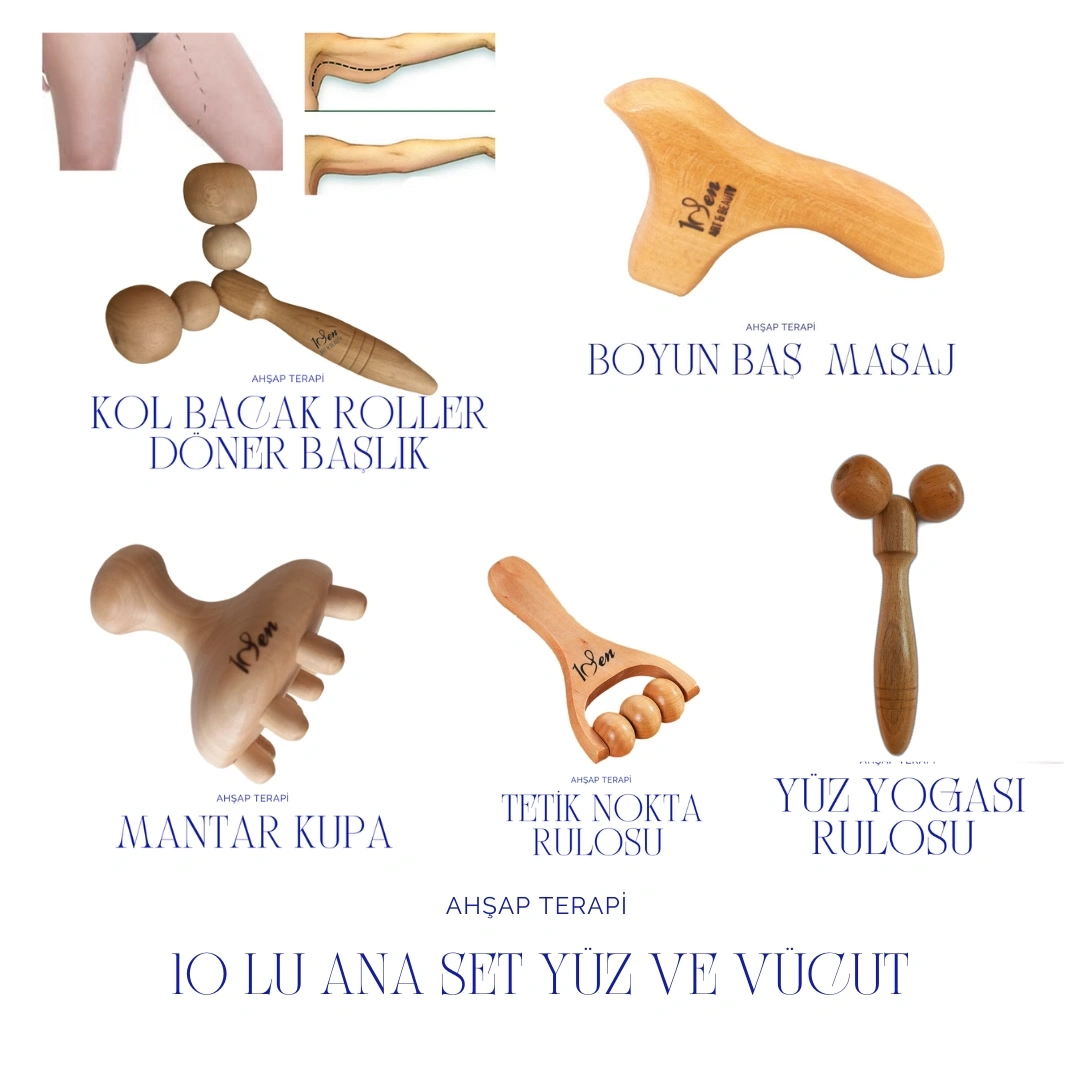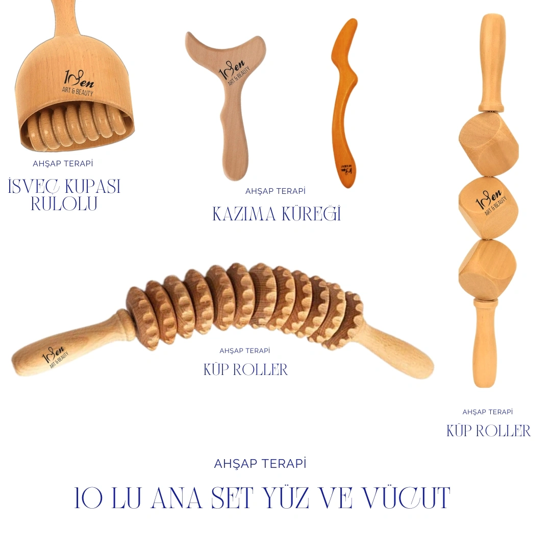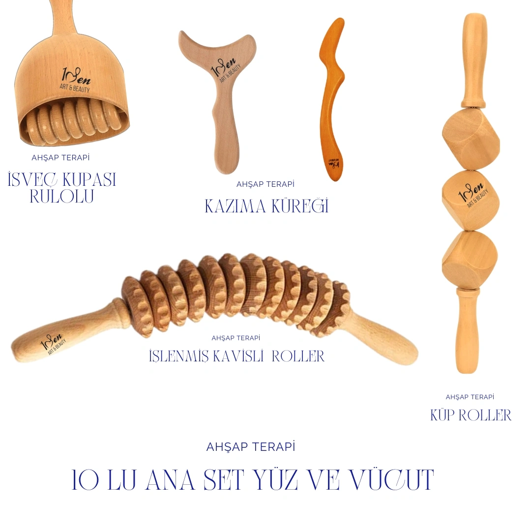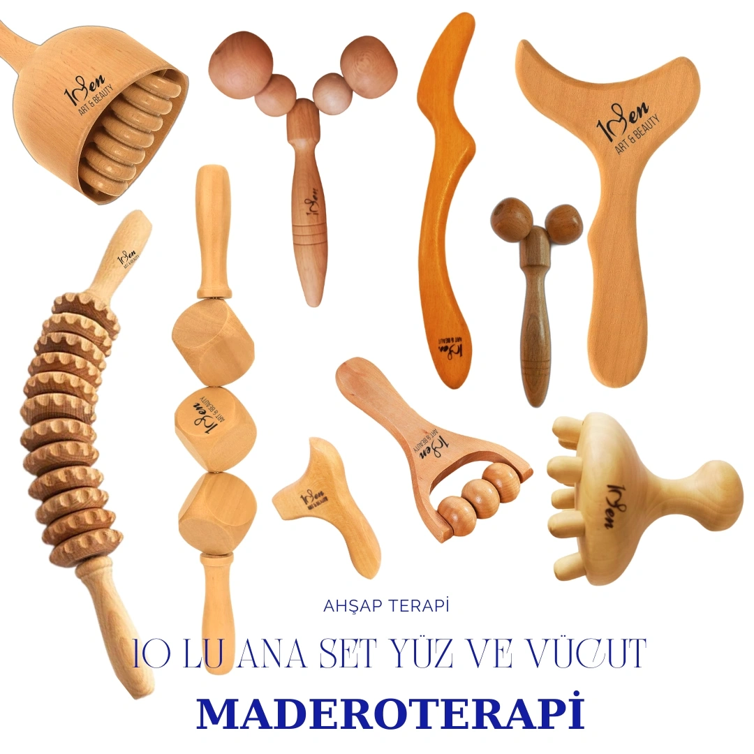 1senartbeauty Maderoterapi 10’lu Ana Set, %100 el yapımı ahşap masaj aletlerinden oluşan kapsamlı bir terapi kitidir. Ahşap malzeme, vernik kullanılmadan özel yağlarla işlenmiş olup, doğal yapısı korunmuştur. Set, yüz ve vücut bölgelerinde selülit görünümünü azaltmaya, lenfatik sistemi aktive etmeye, kan dolaşımını hızlandırmaya ve cildi sıkılaştırmaya yardımcı olur. Ayrıca, öfrelaş (fırçalama) tekniğiyle cilt yenilenmesine destek sağlar.